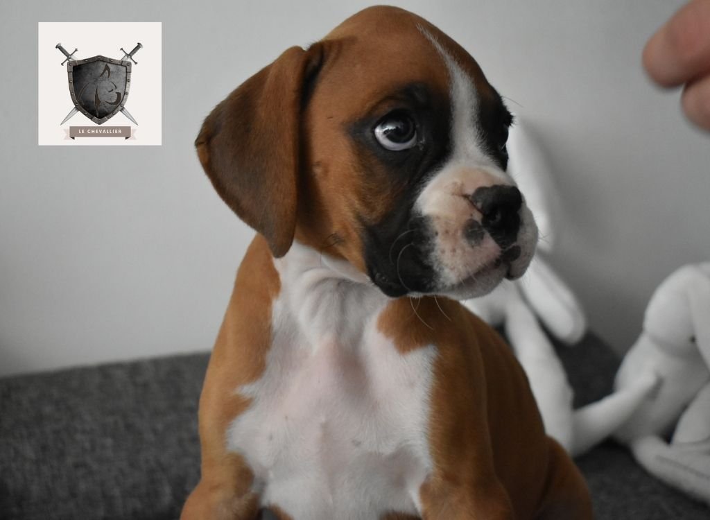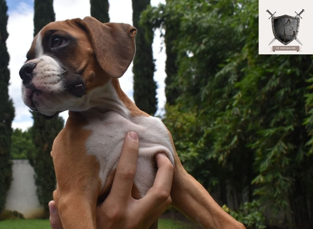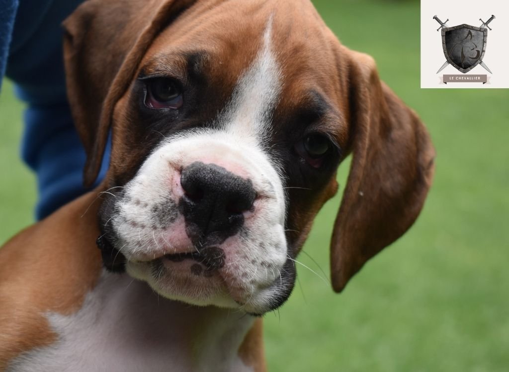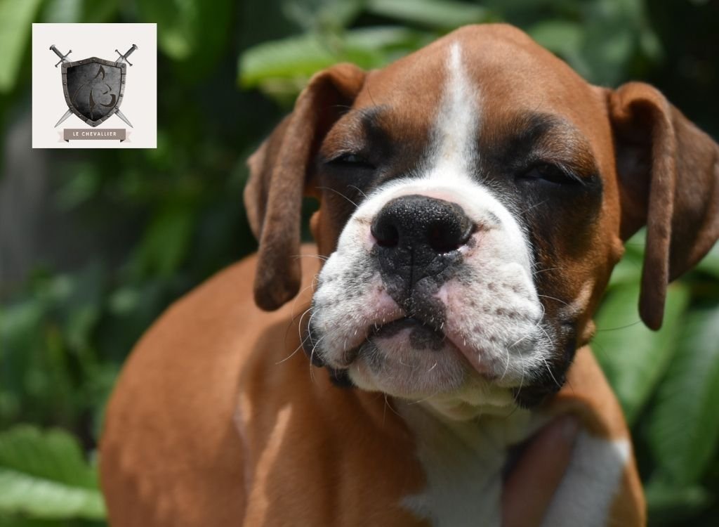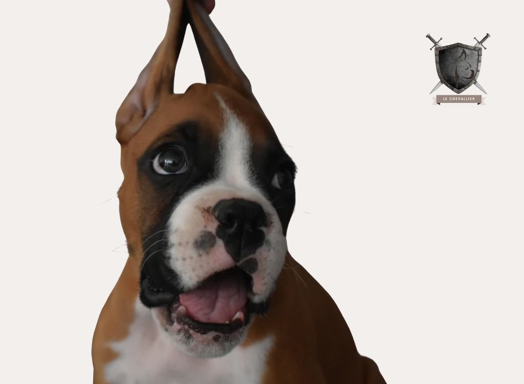 Este hermoso macho bóxer de pelaje leonado con blanco, nacido en el Criadero Le Chevallier, destaca por su gran inteligencia y su constante disposición para aprender y complacer.