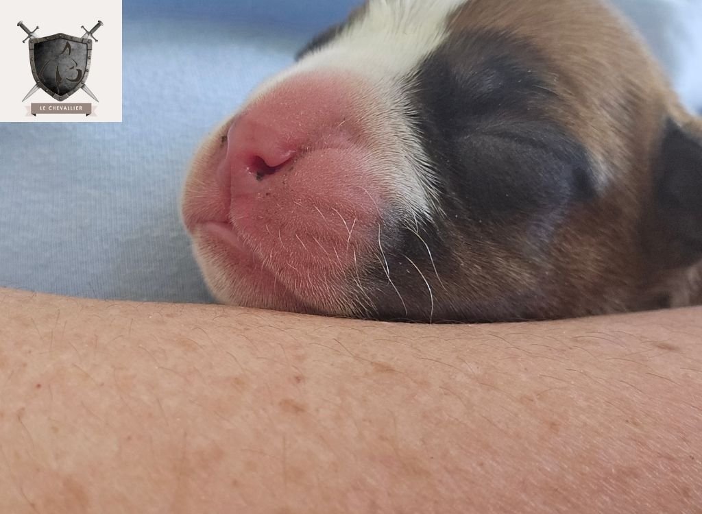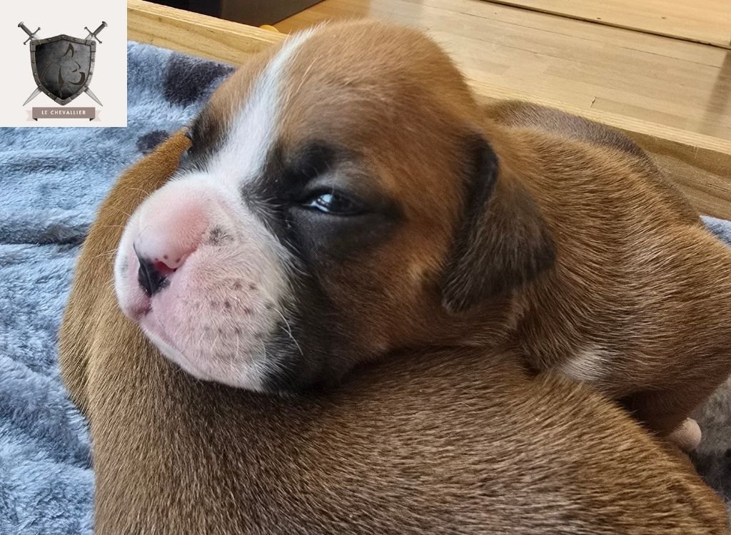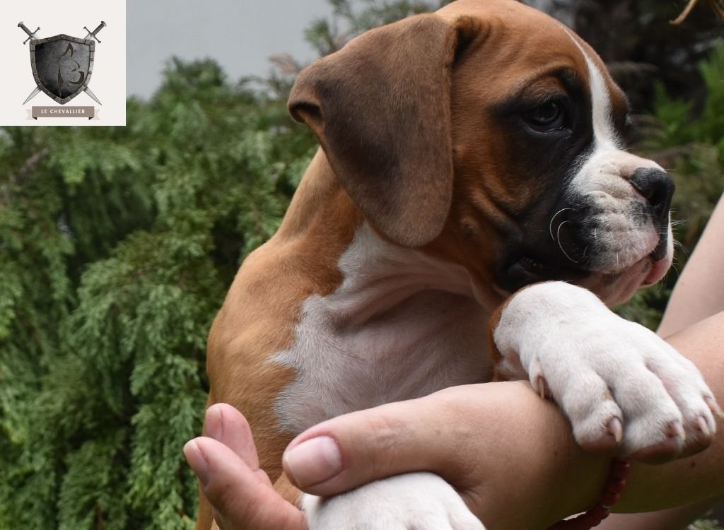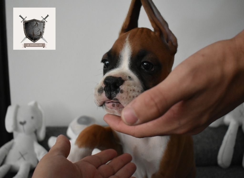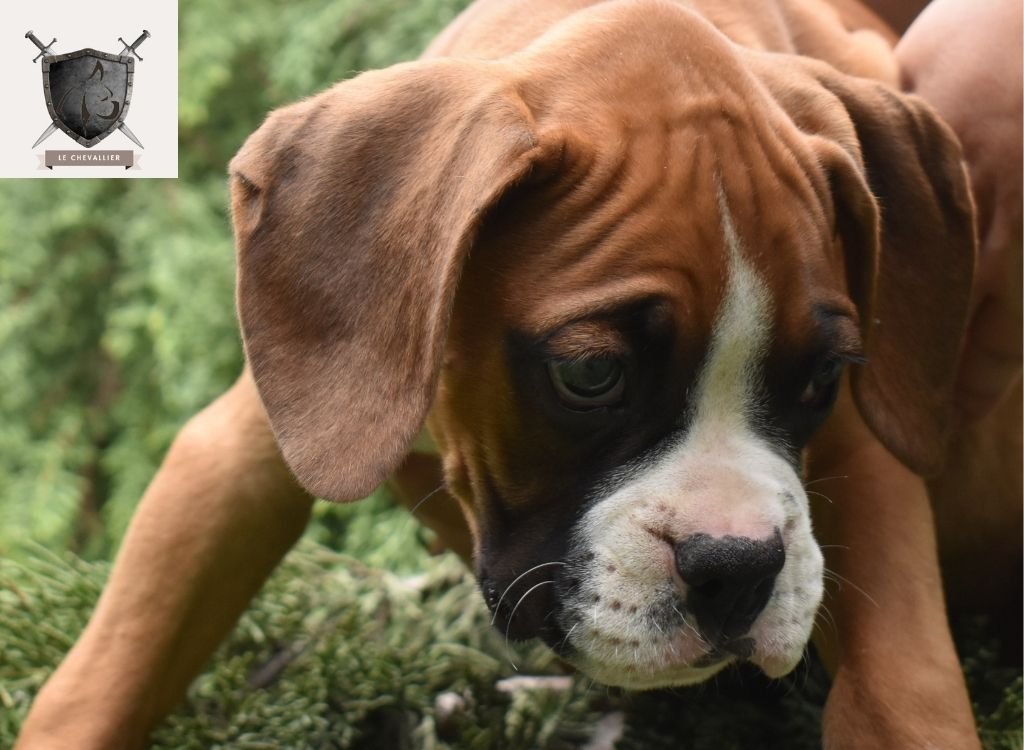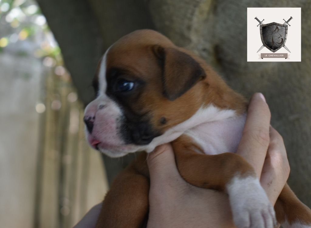Este hermoso macho bóxer de pelaje leonado con blanco, nacido en el Criadero Le Chevallier, destaca por su gran inteligencia y su constante disposición para aprender y complacer.